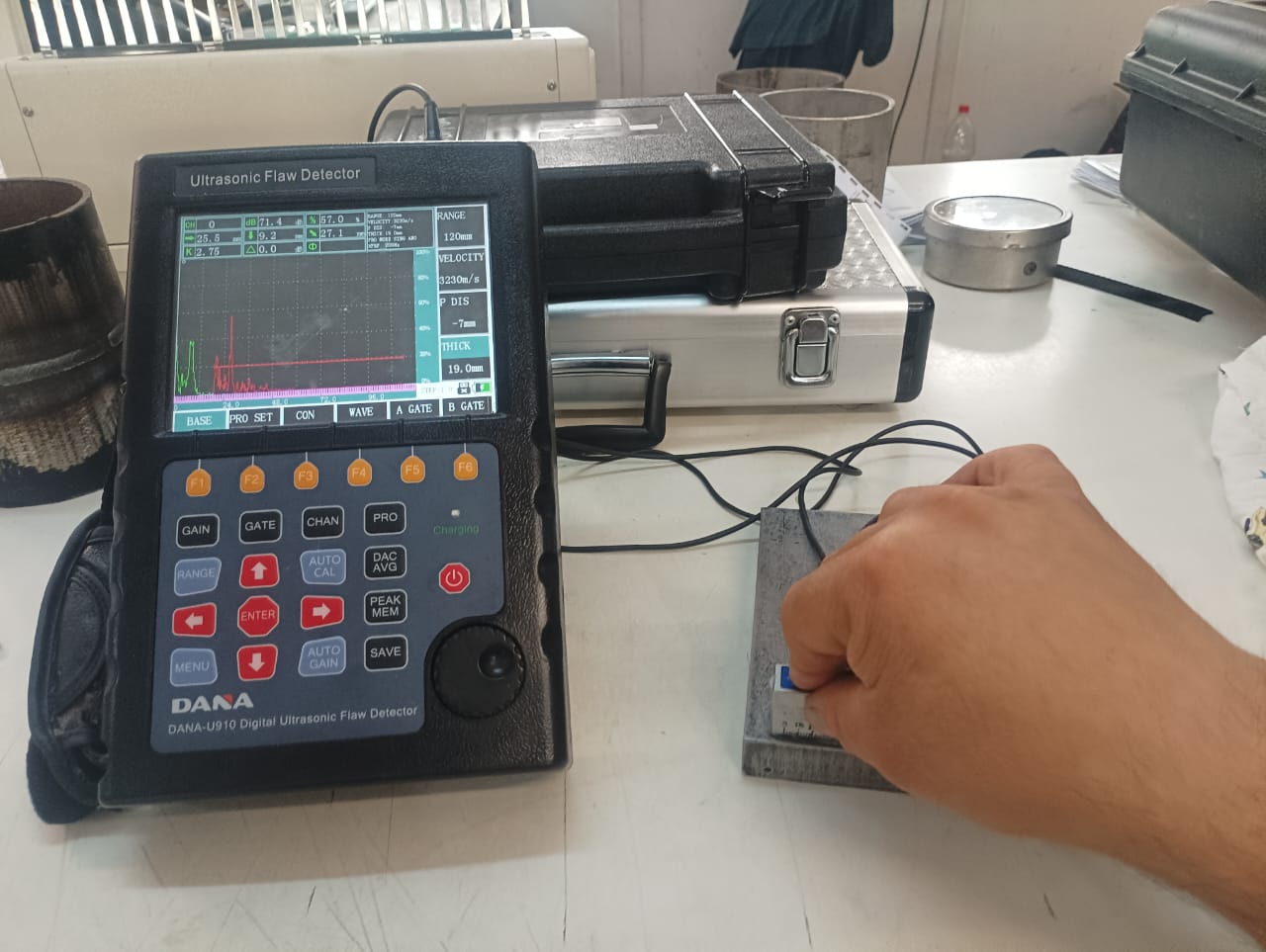 Técnica de inspección mediante pulsos de ultrasonido emitidos desde una fuente emisora.
